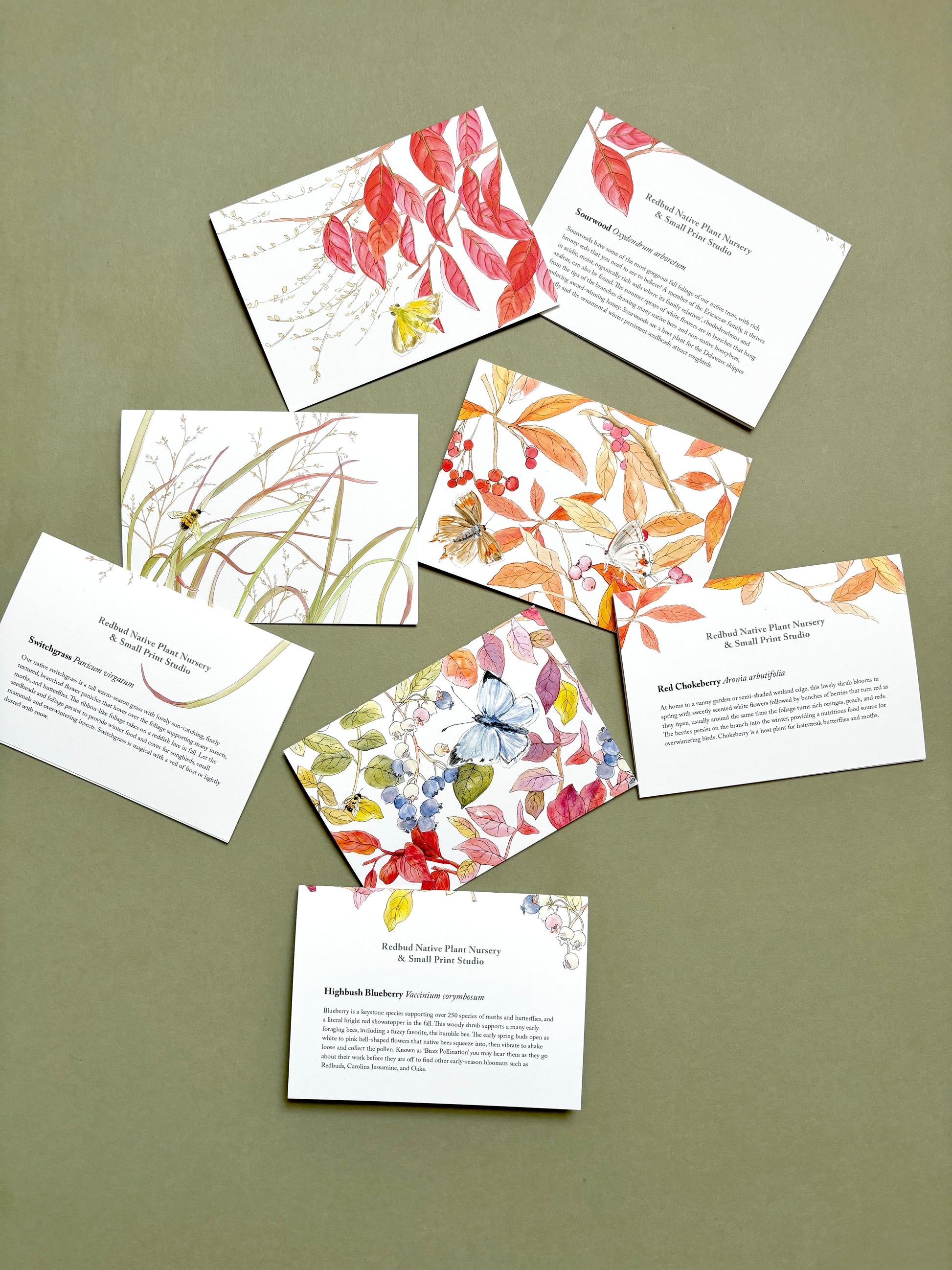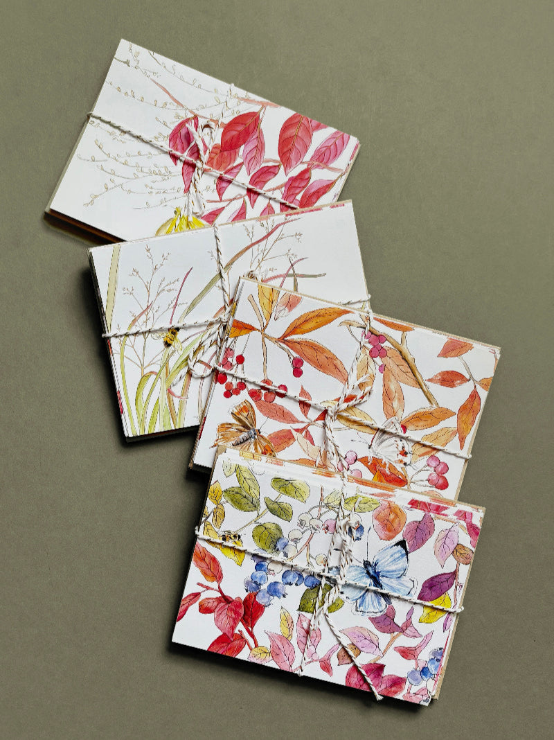 A set of illustrated cards that not only capture the breathtaking beauty of fall's late-season colors but also highlight the intricate relationships between insects and their ecosystems. Each card is a visual ode to the vibrant hues of autumn along with descriptions on the back. Perfect for expressing sentiments of gratitude, friendship, or love, these cards invite the sender and recipient to reflect on the interconnectedness that binds us all.